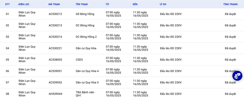 | 7 | Điện Lực Quy Nhơn | AC539052 | Dân cư Quy Hòa 5 | 07:00 16/05/2025 | 11:30 16/05/2025 | Đấu lèo ĐD 22KV | Đã duyệt |