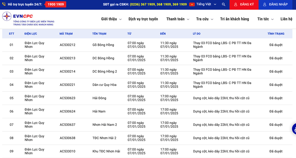 | 4 | Điện Lực Quy Nhơn | AC530221 | Dân cư Quy Hòa | 07:00 07/01/2025 | 11:30 07/01/2025 | Thay 03 FCO bằng LBS- C PĐ TT HN Đa Ngành | Đã duyệt |