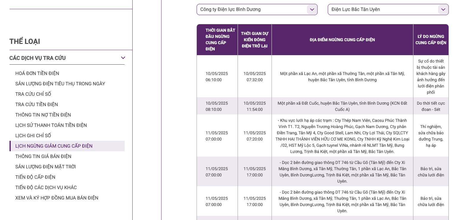 | 11/05/2025 6:00:00 | 11/05/2025 18:00:00 | Khu vực từ Ngã 4 Bình Chuẩn dọc đường Lý Tự Trọng đến Cây xăng Khánh Hội, các đường Bình Chuẩn 31, 40, 42, 43, 55, 76 Phường Bình Chuẩn (Thuận An), đường Tân Phước Khánh 09, 12 Phường Tân Phước Khánh (TP Tân Uyên) | Bảo trì, sửa chữa lưới điện |