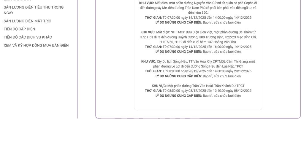 Lịch cắt điện tại các khu vực trên địa bàn Cần Thơ ngày 14/12/2025 được cập nhật tại website của Tổng công ty Điện lực miền Nam (EVNSPC).