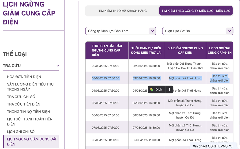 Lịch ngừng cấp điện trên địa bàn Cần Thơ ngày mai 3/3 được cập nhật lúc 11h15 ngày 2/3 tại website của EVNSPC.