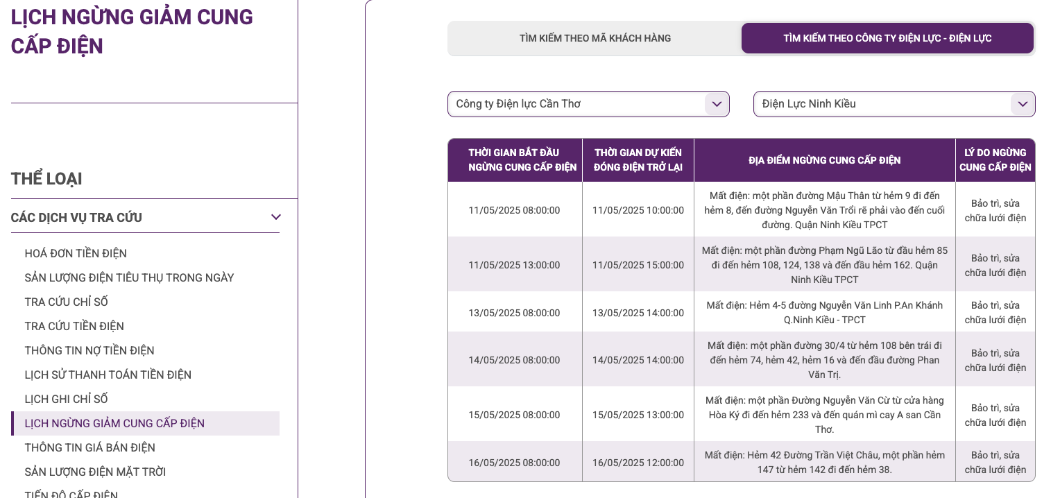 Lịch ngừng cấp điện trên địa bàn Cần Thơ ngày mai 11/5 được cập nhật tại website của EVNSPC.