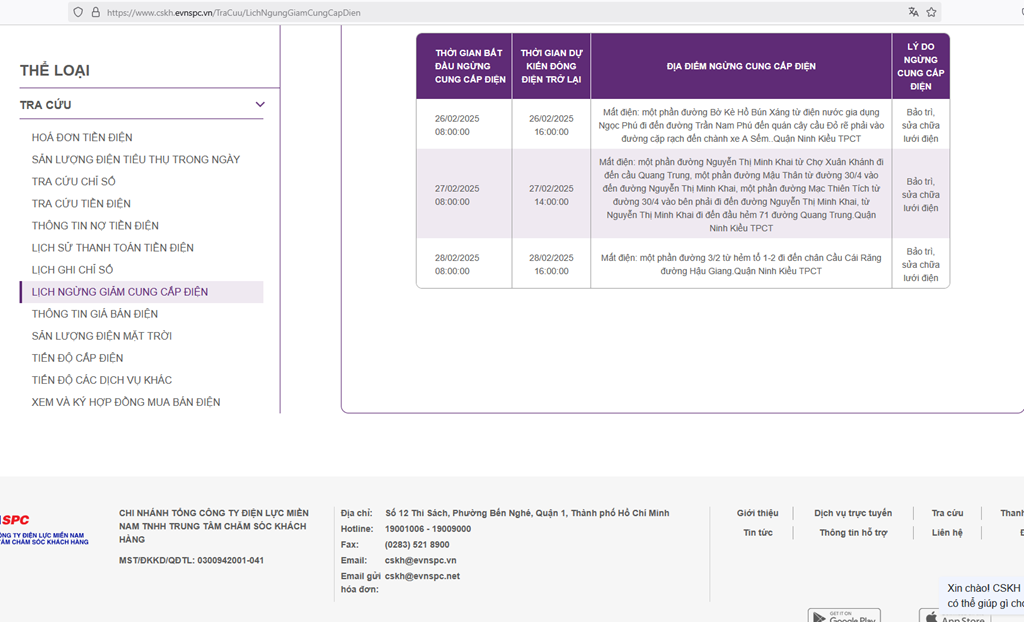 Lịch cắt điện tại các quận, huyện trên địa bàn Cần Thơ ngày mai 27/02 được cập nhật tại website của Tổng công ty Điện lực miền Nam (EVNSPC).