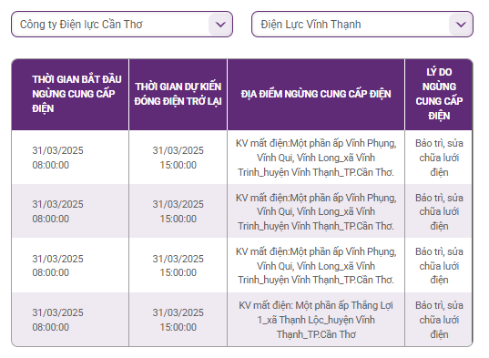 | 31/03/2025 08:00:00 | 31/03/2025 15:00:00 | KV mất điện: Một phần ấp Thắng Lợi 1_xã Thạnh Lộc_huyện Vĩnh Thạnh_TP.Cần Thơ | Bảo trì, sửa chữa lưới điện |