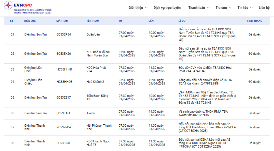 Điện lực Sơn Trà EC53EX68 Đặng Thái Thân 08:30 01/04/2025 12:00 01/04/2025 Đấu nối san tải hạ áp từ TBA Đặng Thái Thân đz 471 T2.NHS qua TBA Sơn Thủy 1 đz 471 T2.NHS