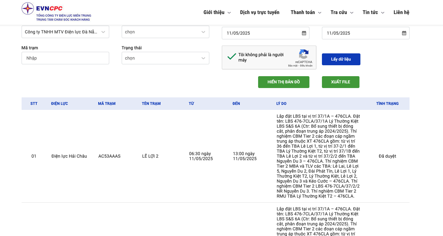 | Điện lực Hải Châu | AC53AB12 | NGUYỄN DU 3 | 06:30 11/05/2025 | 13:00 11/05/2025 | Lắp đặt LBS tại vị trí 37/1A – 476CLA. Đặt tên: LBS 476-7CLA/37/1A Lý Thường Kiệt