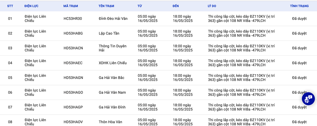 6 Điện lực Liên Chiểu HD53HAGO Ga Hải Vân Nam 05:00 16/05/2025 18:00 16/05/2025 Thi công lắp cột, kéo dây ĐZ110KV (vị trí 363) gần cột 108 NR ViBa -479LCH Đã duyệt