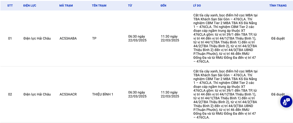 | 1 | Điện lực Hải Châu | AC53AABA | TP | 06:30 22/03/2025 | 11:30 22/03/2025 | Cắt tỉa cây xanh, bọc điểm hở cọc MBA tại TBA Khách Sạn Sài Gòn – 476CLA. Thí nghiệm CBM Tier 2 MBA TBA KS Đà Nẵng 1 – 476CLA. Thí nghiệm CBM Tier 2 các đoạn cáp ngầm trung áp thuộc XT 476CLA gồm: từ vị trí 39/1 đến TBA TP, từ vị trí 44 đến vị trí 44/1(TBA Thiệu Bình 1), từ vị trí 44/1(TBA Thiệu Bình 1) đến vị trí 44/2(TBA Thiệu Bình 2), từ vị trí 44/2(TBA Thiệu Bình 2) đến vị trí 44/3(TBA UBND P.Thuận Phước), từ vị trí 46 đến RMU Đống Đa và từ RMU Đống Đa đến vị trí 47 – 476CLA. | Đã duyệt |