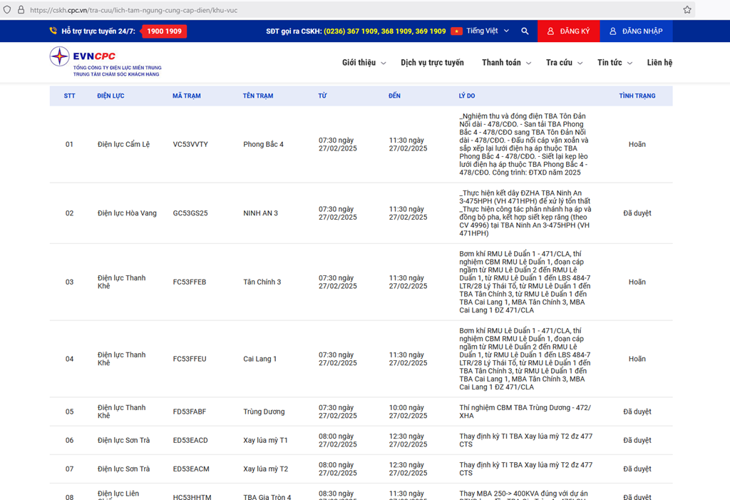 Công ty TNHH MTV Điện lực Đà Nẵng thông báo lịch tạm ngừng cung cấp điện, lịch cúp điện Đà Nẵng ngày mai 27/2 cập nhật mới nhất như sau: