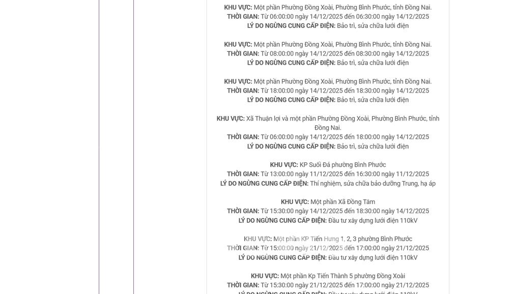 Thông tin về lịch cắt điện cập nhật mới nhất tại tỉnh Đồng Nai ngày 14/12/2025 cập nhật mới nhất.