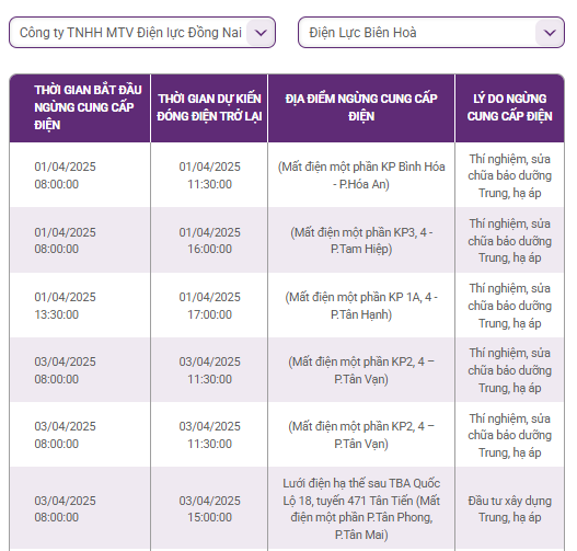 01/04/2025 13:00:00 01/04/2025 16:30:00 Một phần khu vực P. Long Bình Tân Thí nghiệm, sửa chữa bảo dưỡng Trung, hạ áp