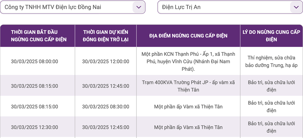 | 30/3/25 08:00 | 30/3/25 12:00 | Một phần KCN Thạnh Phú - Ấp 1, xã Thạnh Phú, huyện Vĩnh Cửu (Nhánh Đại Nam Phát). | Thí nghiệm, sửa chữa bảo dưỡng Trung, hạ áp |