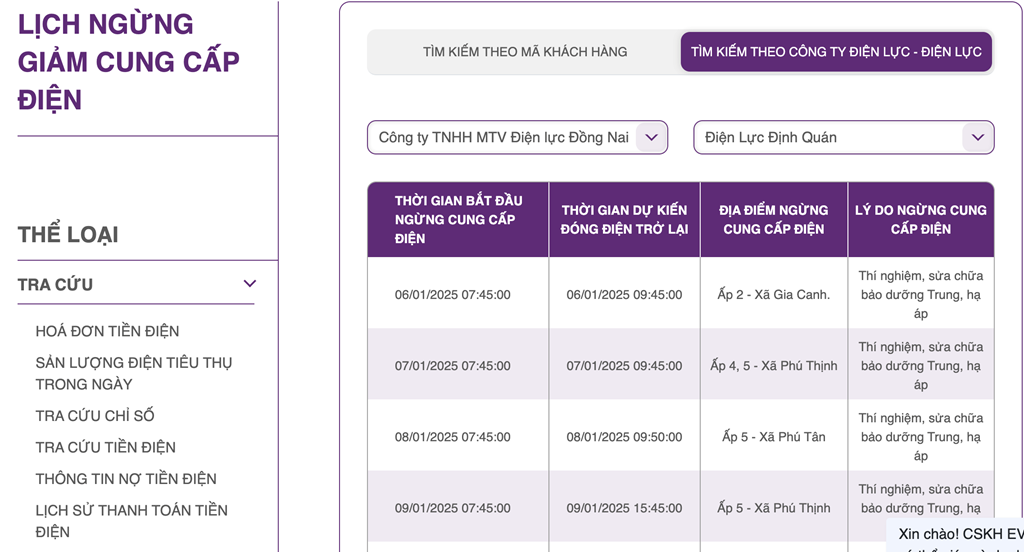| 07/01/2025 13:45:00 | 07/01/2025 16:00:00 | Ấp 9 - Xã Phú Thịnh | Thí nghiệm, sửa chữa bảo dưỡng Trung, hạ áp |