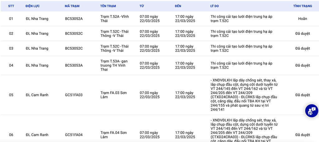 | 1 | ĐL Nha Trang | BC53052A | Trạm T.52A -Vĩnh Thái | 07:00 22/03/2025 | 17:00 22/03/2025 | Thi công cải tạo lưới điện trung hạ áp trạm T.52C | Hoãn |