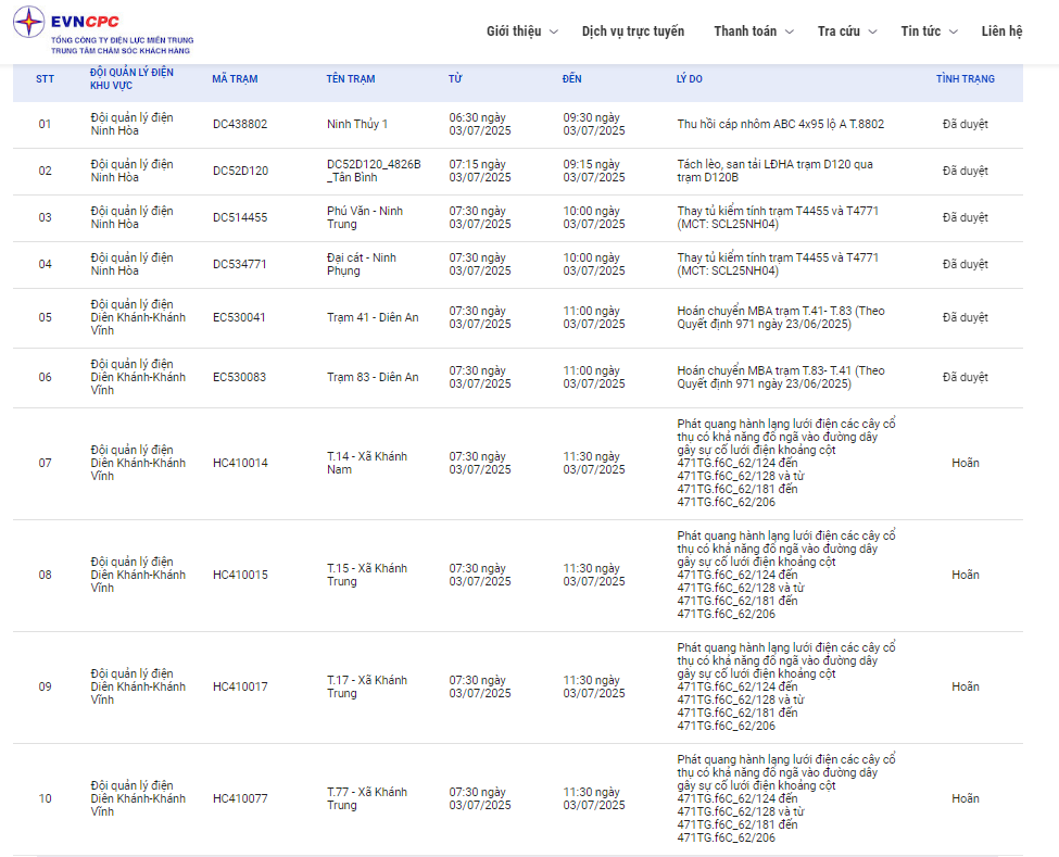 | Đội quản lý điện Diên Khánh-Khánh Vĩnh | HC410120 | T.120 - Xã Khánh Bình | 07:30 03/07/2025 | 11:30 03/07/2025 | Phát quang hành lang lưới điện các cây cổ thụ có khả năng đổ ngã vào đường dây gây sự cố lưới điện khoảng cột 471TG.f6C_62/124 đến 471TG.f6C_62/128 và từ 471TG.f6C_62/181 đến 471TG.f6C_62/206 | Hoãn |