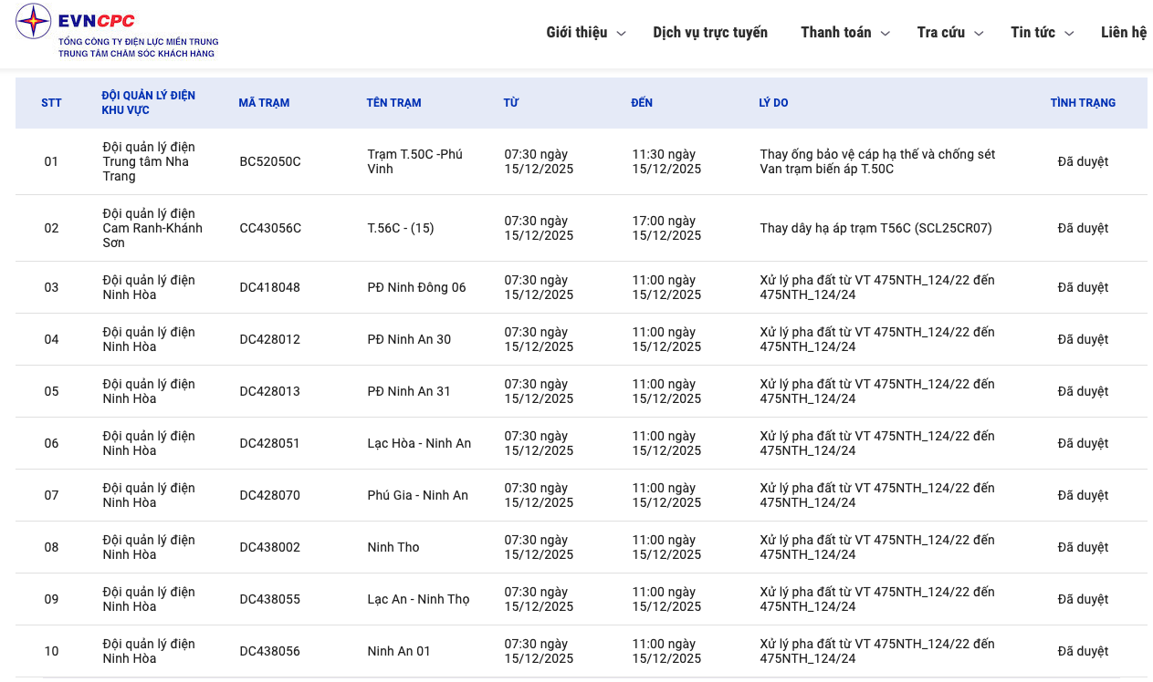 | Đội quản lý điện Trung tâm Nha Trang | BC52050C | Trạm T.50C -Phú Vinh | 07:30 15/12/2025 | 11:30 15/12/2025 | Thay ống bảo vệ cáp hạ thế và chống sét Van trạm biến áp T.50C | Đã duyệt |