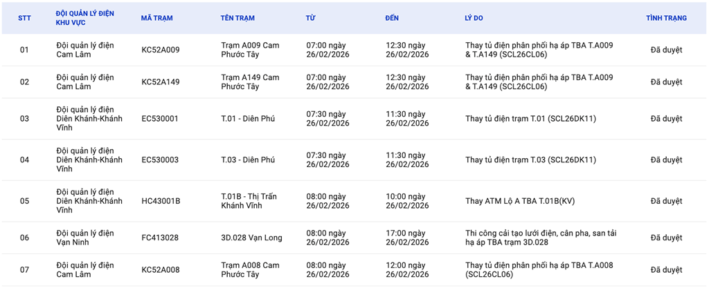 | 7 | Đội quản lý điện Cam Lâm | KC52A008 | Trạm A008 Cam Phước Tây | 08:00 26/02/2026 | 12:00 26/02/2026 | Thay tủ điện phân phối hạ áp TBA T.A008 (SCL26CL06) | Đã duyệt |