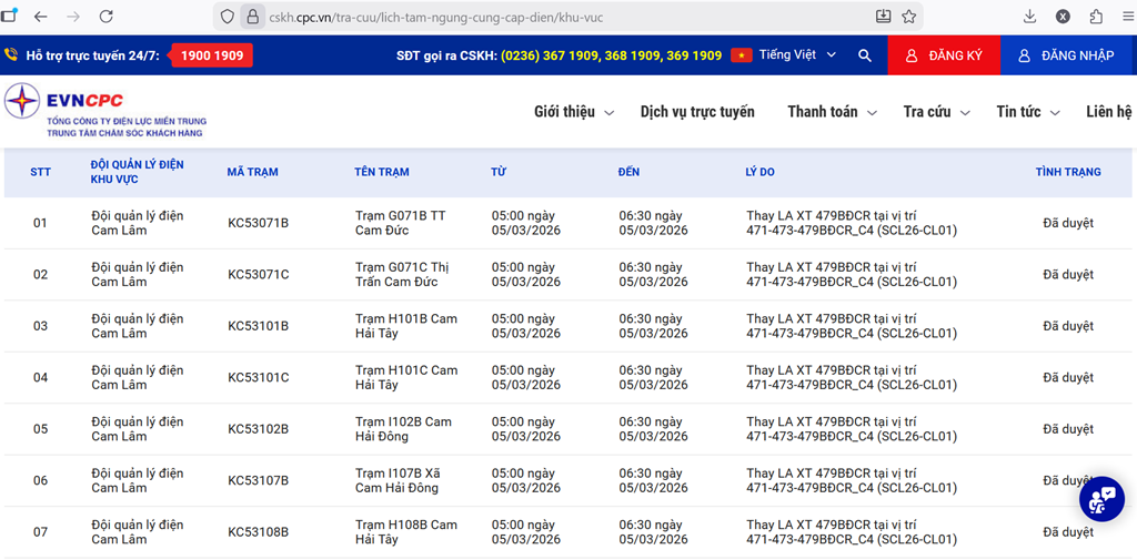 | Đội quản lý điện Cam Lâm | KC53071C | Trạm G071C Thị Trấn Cam Đức | 05:00 05/03/2026 | 06:30 05/03/2026 | Thay LA XT 479BĐCR tại vị trí 471-473-479BĐCR_C4 (SCL26-CL01) | Đã duyệt |