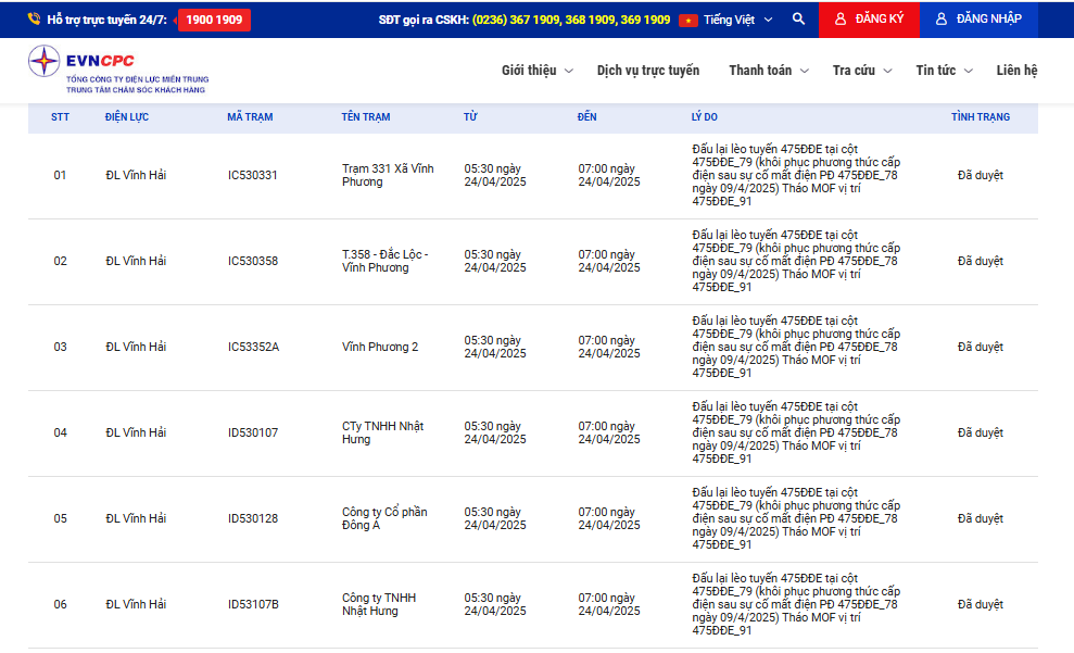 ĐL Vĩnh Hải ID530128 Công ty Cổ phần Đông Á 05:30 24/04/2025 07:00 24/04/2025 Đấu lại lèo tuyến 475ĐĐE tại cột 475ĐĐE_79 (khôi phục phương thức cấp điện sau sự cố mất điện PĐ 475ĐĐE_78 ngày 09/4/2025)