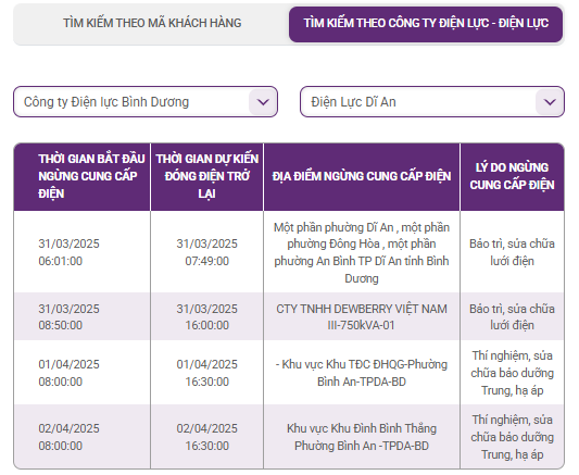| 01/04/2025 08:00:00 | 01/04/2025 16:30:00 | - Khu vực Khu TĐC ĐHQG-Phường Bình An-TPDA-BD | Thí nghiệm, sửa chữa bảo dưỡng Trung, hạ áp |
