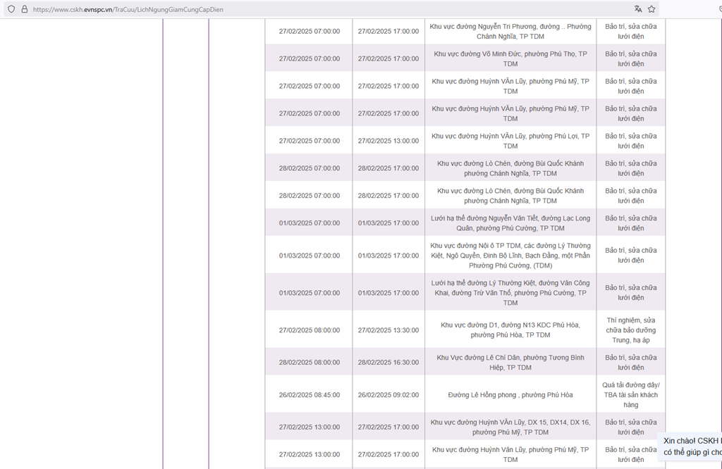 | 27/02/2025 07:00:00 | 27/02/2025 17:00:00 | Khu vực đường Võ Minh Đức, phường Phú Thọ, TP TDM | Bảo trì, sửa chữa lưới điện |