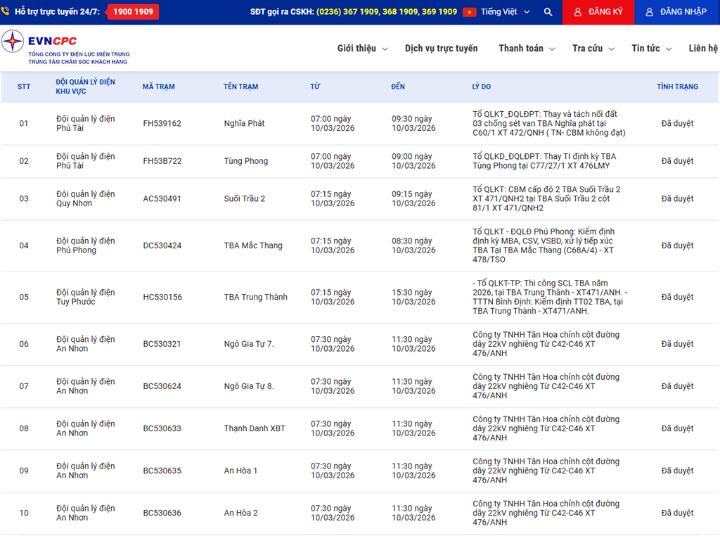 | 2 | Đội quản lý điện Phú Tài | FH53B722 | Tùng Phong | 07:00 10/03/2026 | 09:00 10/03/2026 | Tổ QLKD_ĐQLĐPT: Thay TI định kỳ TBA Tùng Phong tại C77/27/1 XT 476LMY | Đã duyệt |