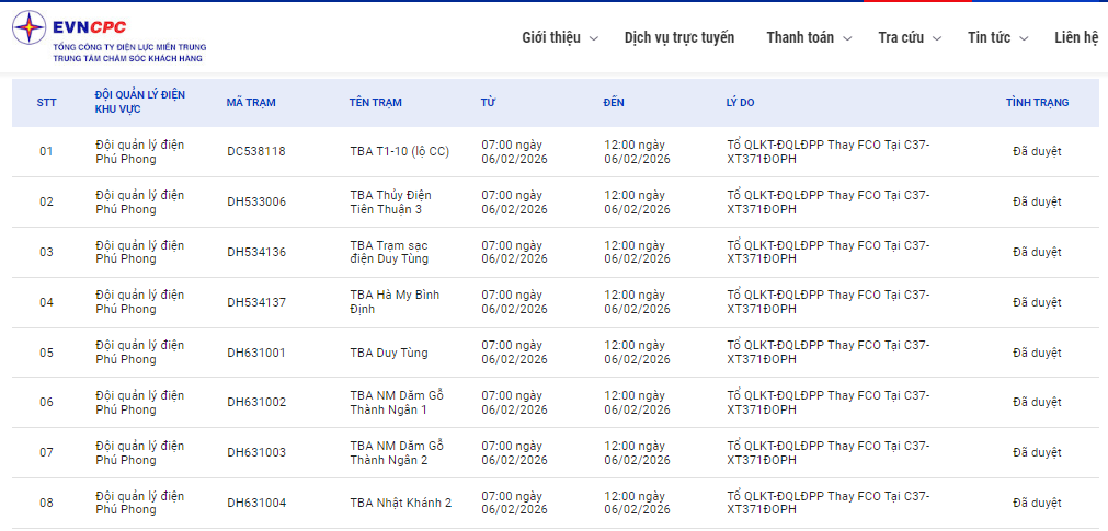 | Đội quản lý điện Phú Phong | DH534136 | TBA Trạm sạc điện Duy Tùng | 07:00 06/02/2026 | 12:00 06/02/2026 | Tổ QLKT-ĐQLĐPP