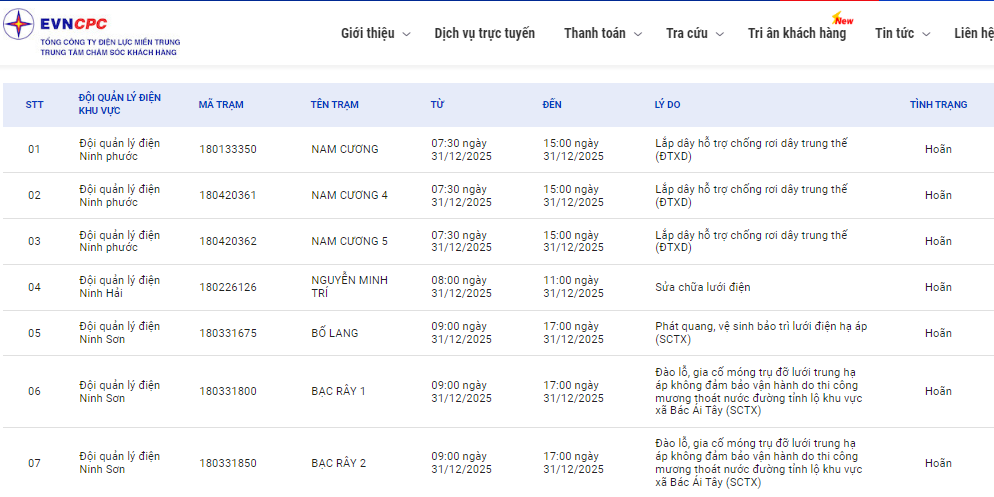 | Đội quản lý điện Ninh Sơn | 180331850 | BẠC RÂY 2 | 09:00 31/12/2025 | 17:00 31/12/2025 | Đào lỗ, gia cố móng trụ đỡ lưới trung hạ áp không đảm bảo vận hành do thi công mương thoát nước đường tỉnh lộ khu vực xã Bác Ái Tây (SCTX) | Hoãn |