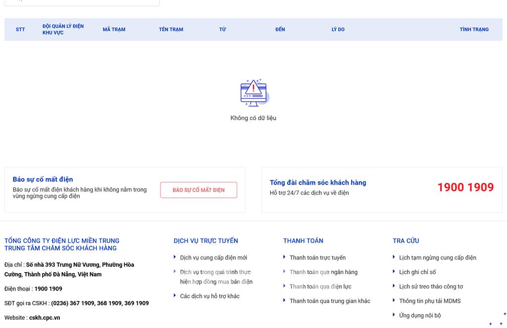 Trong quá trình sử dụng dịch vụ điện, khách hàng cần được hỗ trợ hoặc tư vấn, vui lòng liên hệ Trung tâm CSKH Tổng công ty Điện lực miền Trung – số điện thoại: 19001909 để được phục vụ 24/7.