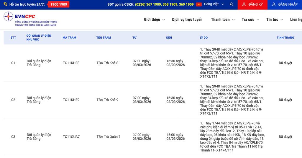 | 2 | Đội quản lý điện Trà Bồng | TC11KHE9 | TBA Trà Khê 9 | 07:00 08/03/2026 | 16:30 08/03/2026 | 1. Thay 2948 mét dây 2 AC/XLPE-70 từ vị trí cột 57-70, cột 65/1. Thay 10 giáp níu 70mm2, 32 khóa néo dây bọc 70mm2, thay 34 kẹp đấu rẽ để đấu lèo...và các phụ kiện đi kèm khác từ vị trí 57-70, cột 65/1. Thay 06m dây AC/XLPE-70 từ đỉnh cột đến FCO TBA Trà Khê 8,9 - NR Trà Khê 9- XT472/T11 | Đã duyệt |