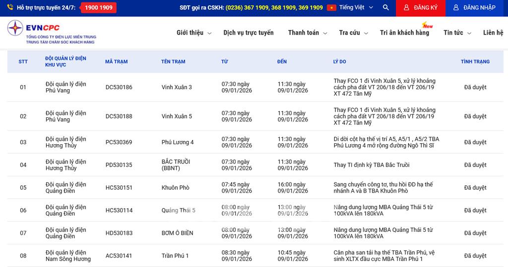 | 10 | Đội quản lý điện Phú Vang | DC530179 | Vinh Thanh 7 | 13:30 09/01/2026 | 16:00 09/01/2026 | Thay AB tổng, xử lý tiếp xúc tủ hạ thế TBA Vinh Thanh 7 | Đã duyệt |
