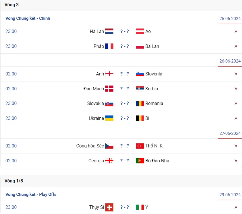 Lịch thi đấu Euro 2024 hôm nay 25/06