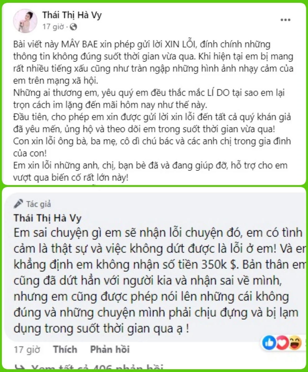 Mới đây trên Facebook cá nhân, Mây Bae đăng tải bài viết dài lên tiếng về ồn ào đời tư. Mở đầu, hot girl sinh năm 2001 gửi lời xin lỗi và đính chính những tin đồn trong thời gian qua: "Đầu tiên, cho phép em xin được gửi lời xin lỗi đến tất cả quý khán giả đã yêu mến, ủng hộ và theo dõi em trong suốt thời gian vừa qua!