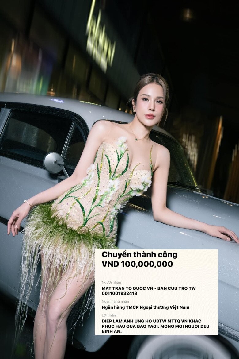 Diệp Lâm Anh cũng đã quyên góp 100 triệu đồng. Nữ ca sĩ nhắn nhủ: “Chưa bao giờ nhìn thấy Hà Nội của Cún tang thương đến vậy. Cây đổ, mưa lớn, ngập nước khắp nơi. Nhưng đọc tin tức sập cầu, sạt lở, ngập nước ở Thái Nguyên ,Yên Bái, Lào Cai, Bắc Giang, Lạng Sơn, Phú Thọ, Cao Bằng, Hà Nội, Quảng Ninh, Hải Phòng… còn đau lòng hơn. Cầu mong nước rút thật nhanh, để mọi người khắc phục hậu quả sau bão lũ”.