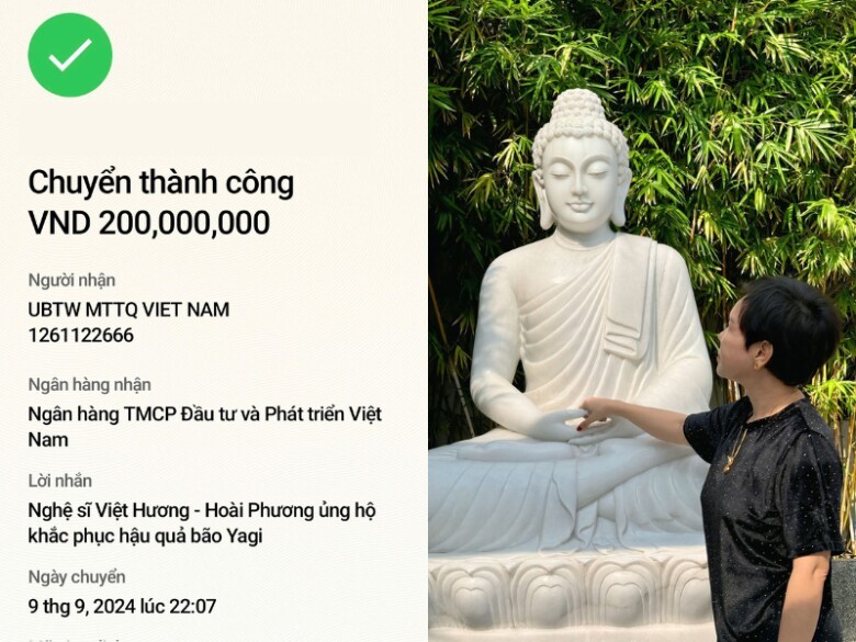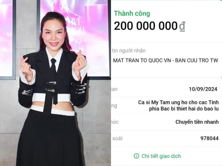 Trên Facebook, Mỹ Tâm cũng cập nhật thông tin chuyển khoản thành công 200 triệu đồng để giúp đỡ người dân vùng bão lũ. Đồng thời, cô cũng cảm ơn người hâm mộ của mình đã chung tay chia sẻ khó khăn với bà con.