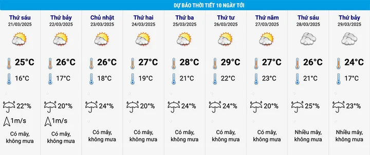 Từ 21-26/3, khu vực này có mây, không mưa, nắng mạnh hơn, nhiệt độ tăng dần theo từng ngày, thấp nhất tăng từ 16°C lên 22°C, cao nhất tăng từ 25°C lên 29°C.