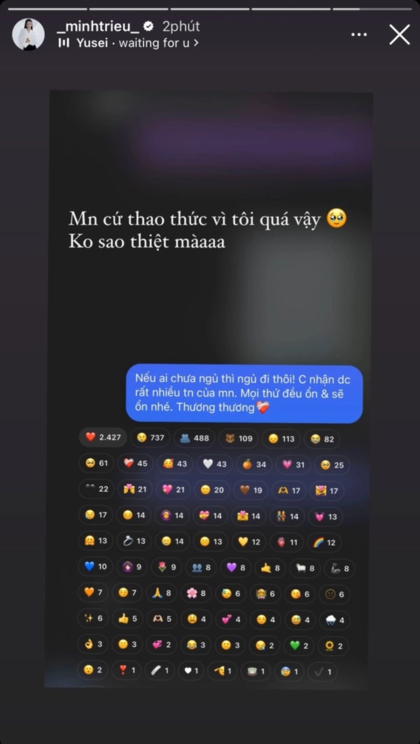 Cho đến tối 28/2, Minh Triệu gây chú ý khi chia sẻ tâm trạng hiện tại và gửi lời nhắn nhủ đến fan. Minh Triệu gửi lời cảm ơn đến những lời động viên của người hâm mộ trong thời gian qua. Nữ siêu mẫu cho biết trong thời gian tới sẽ nạp lại năng lượng và trở lại sớm với khán giả.