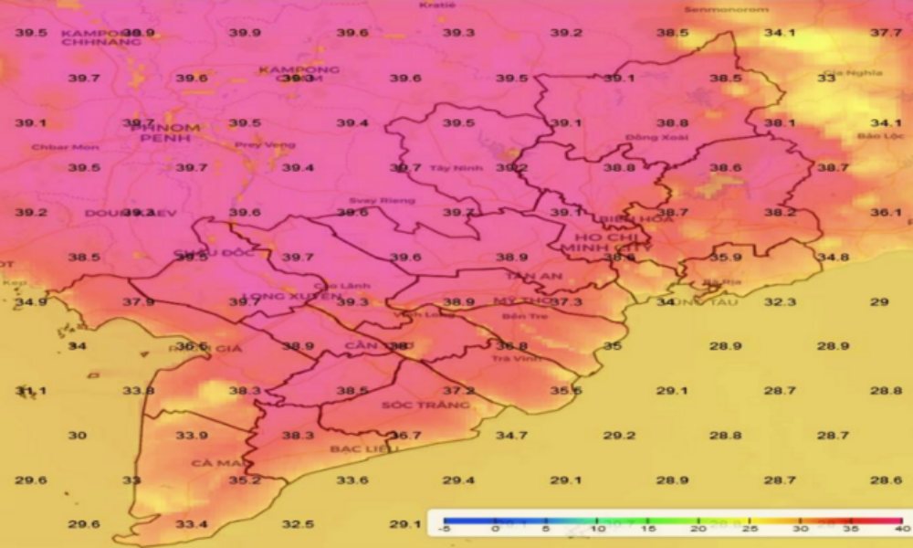 Các tỉnh, thành có nhiệt độ dao động 39-40 độ C gồm: Bình Phước, Đồng Nai, Bình Dương, Tây Ninh. TP.HCM, An Giang, Đồng Tháp, Vĩnh Long, Long An.