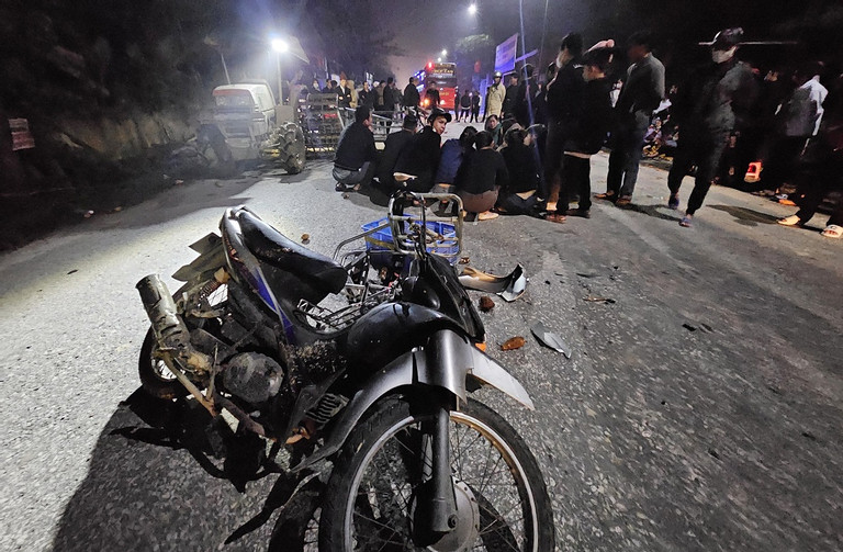 Vụ tai nạn khiến vợ chồng anh N, chị T tử vong tại chỗ. Tại hiện trường, xe máy bị hư hỏng nặng, hàng hóa rơi vãi đầy mặt đường, xe khách bị hư hỏng phần bên trái thân xe.