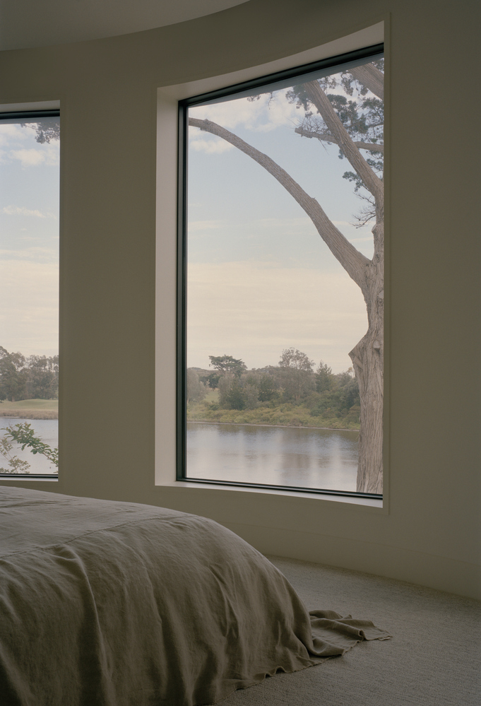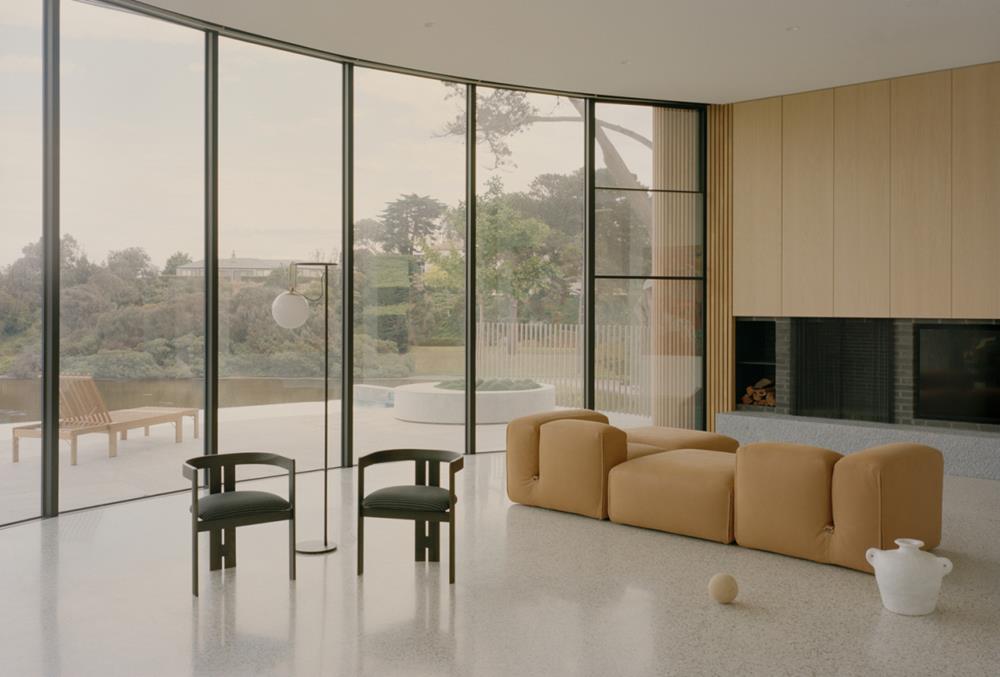 Ngôi nhà một tầng, tọa lạc tại một khu dân cư thuộc Australia, hướng tầm nhìn thoáng rộng ra khung cảnh xanh mát với rừng cây và hồ nước phía trước.
