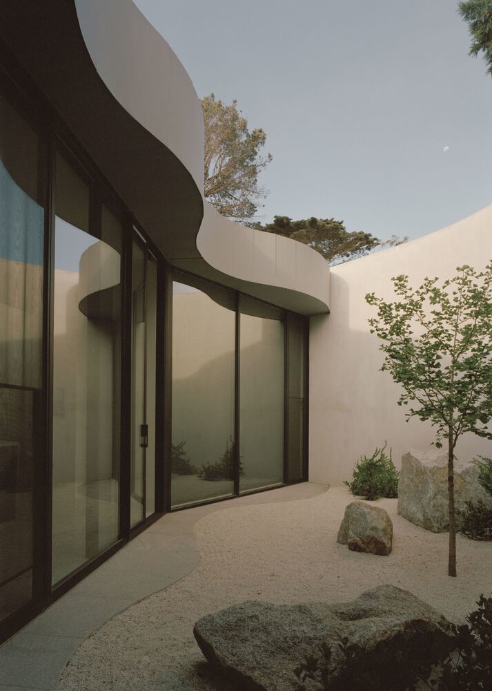 Kết cấu công trình gồm mặt tiền ốp lớp vỏ gỗ cong, các bức tường phân chia khu vực chức năng và một loạt các khoang tiện ích bao bọc quanh một sân trong.