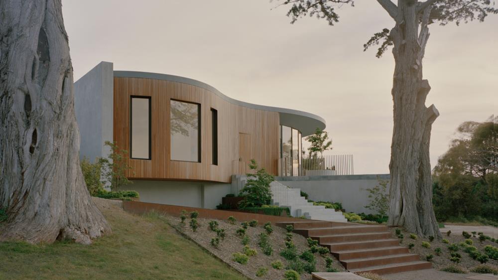 Bao bọc ngoài mặt tiền là lớp ốp vỏ gỗ cong như những con sóng, giúp công trình hài hòa với môi trường xung quanh.