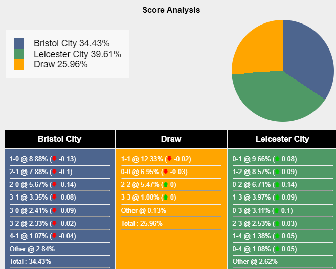 Tỷ số khả dĩ nhất để Leicester City thắng là 0-1 với xác suất 9,66%. Tỷ số có khả năng xảy ra tiếp theo cho kết quả đó là 1-2 (8,57%) và 0-2 (6,71%). Tỷ số có khả năng thắng nhất của Bristol City là 1-0 (8,88%), trong khi tỷ số hòa là 1-1 (12,33%).