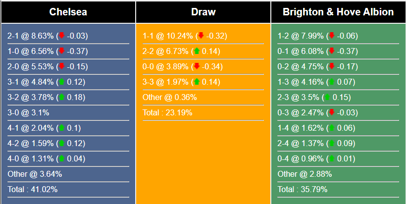 Tỉ số có khả năng cao nhất giúp Chelsea giành chiến thắng là 2-1 với xác suất 8,63%. Tỷ số có khả năng xảy ra tiếp theo cho kết quả đó là 1-0 (6,56%) và 2-0 (5,53%) . Tỷ số có khả năng thắng Brighton cao nhất là 1-2 (7,99%) , trong khi tỷ số hòa là 1-1 (10,24%) .