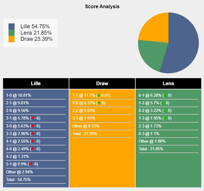 Sau đây sẽ là những thống kê xác suất kết quả trước trận đấu theo trang bóng đá nổi tiếng Sport Mole. Được thi đấu trên sân nhà sẽ là lợi thế lớn cho câu lạc bộ Lille. Vậy nên đội bóng này được đánh giá cao sẽ giành chiến thắng với tỷ lệ 54.75% . Về phía đội khách Lens thì xác suất thắng trận này của họ chỉ là 21.86% . Còn khả năng 2 đội phải chia điểm là 23.39% .
