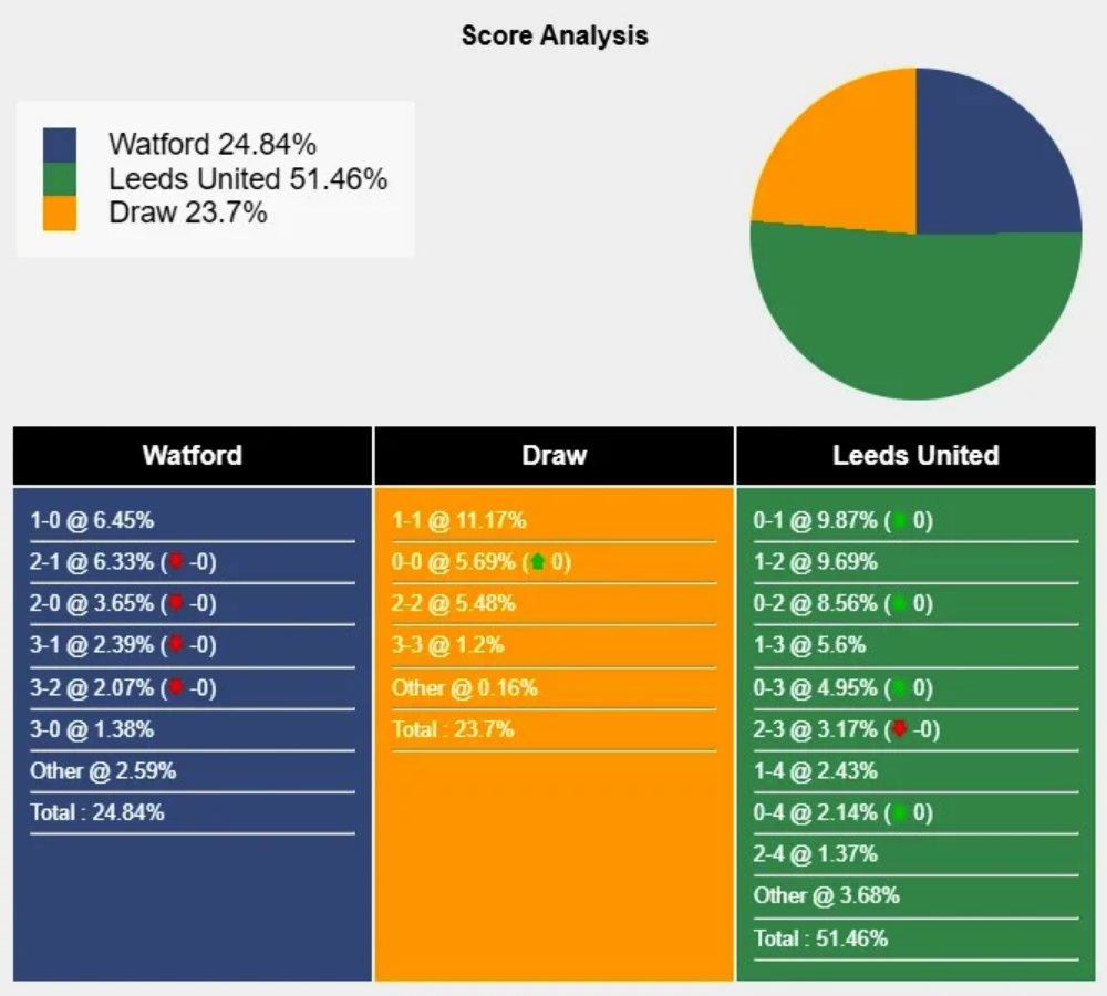 Với các tỷ số có khả năng xảy ra, việc Watford thắng lợi 1-0 đạt 6,45% . Khả năng 90 phút tới hai đội cầm hòa nhau 1-1 đạt 11,17% . Việc đội khách Leeds United đánh bại Watford 1-0 là 9,87% .