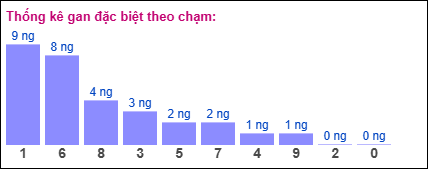 ⇒ Theo dõi thống kê gan đặc biệt theo chạm, ta thấy chạm 1 lâu chưa xuất hiện nhất (bao gồm 19 cặp số chứa số 1), và đã 9 ngày chưa xuất hiện.