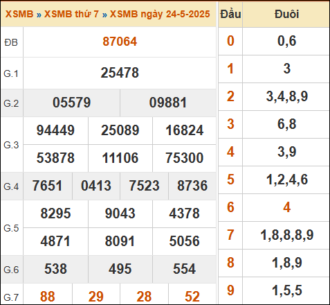 - Thống kê 2 số cuối giải đặc biệt XSMB ngày 25/05/2025