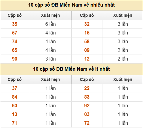 ⚡ 10 cặp số ĐB Miền Nam về nhiều nhất/ ít nhất tính đến ngày 14/06/2025: