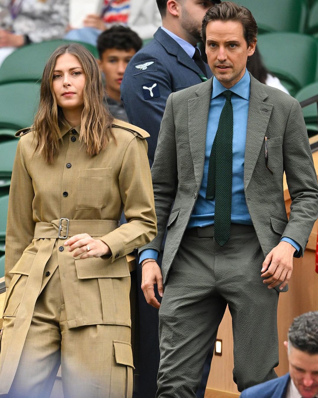 Hôm 3/7, Sharapova cùng bạn trai doanh nhân Alexander Gilke tới Anh theo dõi giải vô địch Wimbledon 2024. Cô diện set phong cách quân đội của Burberry, phối túi và giày cùng thương hiệu.